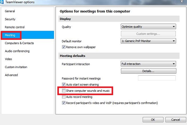 Similarly, you can check the appropriate option in the TeamViewer Meeting settings. Navigate to the main window and click "Extras" > "Options," click the Meeting tab and check Share computer sounds and music.