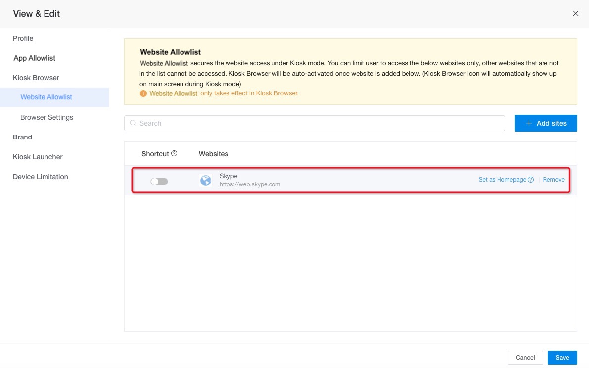 Kiosk Browser > Website Allowlist > + Add Sites