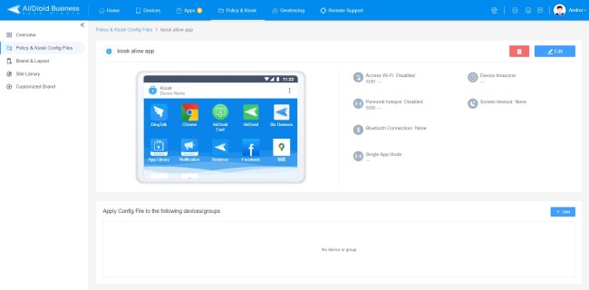 Nachdem Sie das Design erstellt haben, müssen Sie es in Policy & Kiosk Config Files anwenden. Dann wird der angepasste Android-Kiosk-Sperrbildschirm auf dem Gerät angezeigt.