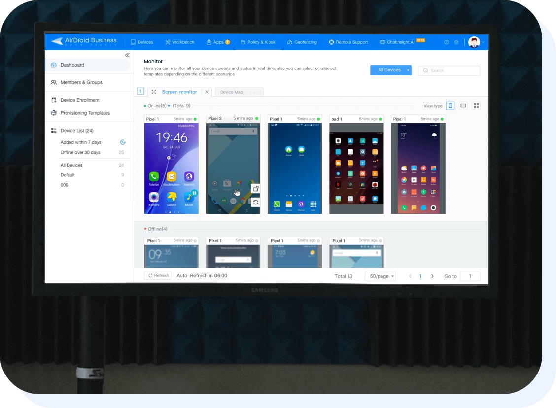 Controle fácilmente sus carteles digitales estáticos y sin supervisar de Android desde un panel de control en la web. AirDroid Business MDM muestra la pantalla de inicio de cada letrero para que pueda ver rápidamente cuáles no funcionan correctamente.
